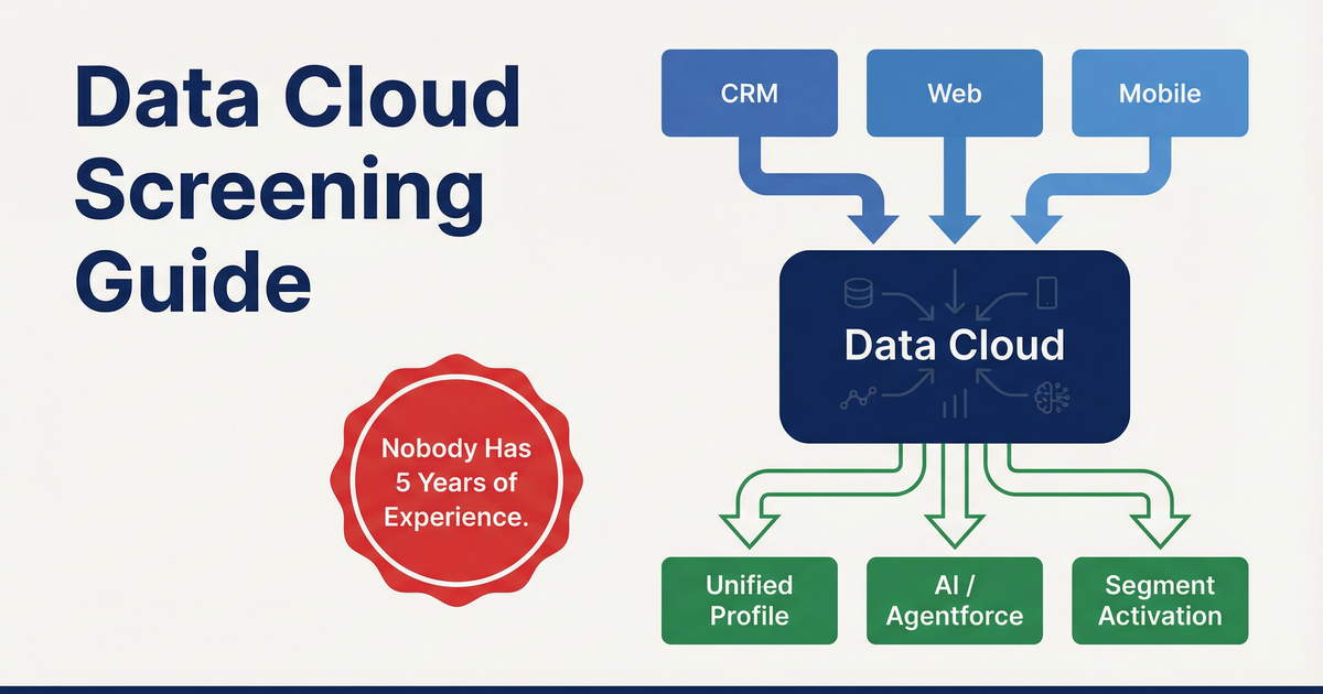 5. "Have you worked with calculated insights or Data Cloud for AI?" Strong: Describes calculated insights for scoring or connecting Data Cloud to Agentforce features. Red flag: Claims extensive experience with zero production use cases. Given how new the product is, this should raise questions immediately.